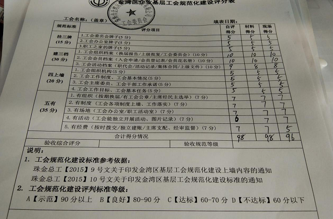 11月6日上午,金灣區(qū)總工會檢查組蒞臨指導(dǎo)規(guī)范工會基層建設(shè)工作,邱影監(jiān)事長及總公司工會委員會全體成員陪同迎檢。