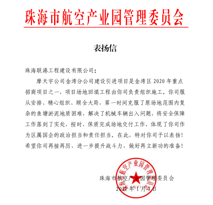 摩天宇工程項(xiàng)目表揚(yáng)信