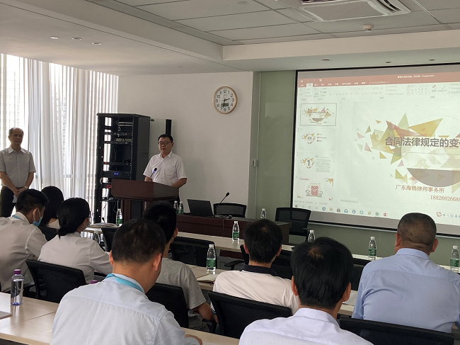 劉付寧律師在講座中,圍繞解除權(quán)行使期限、預(yù)約合同、承諾函的法律效力、違約人解除合同等12項(xiàng)內(nèi)容認(rèn)真解讀了《民法典》合同篇的重要修改條款,深入淺出地分析了5個(gè)合同糾紛經(jīng)典案例,對(duì)違法依據(jù)、適用法律條款、處罰結(jié)果等進(jìn)行認(rèn)真講解,同時(shí)結(jié)合我司日常生產(chǎn)經(jīng)營和物業(yè)管理實(shí)際情況,詳細(xì)闡述了合同簽訂相關(guān)注意事項(xiàng)、合同法律風(fēng)險(xiǎn)防范技巧等法規(guī)知識(shí)。劉律師的講座內(nèi)容豐富,語言幽默,專業(yè)針對(duì)性強(qiáng),現(xiàn)場(chǎng)反響十分熱烈。