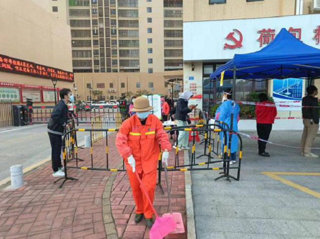 匯建公司環(huán)衛(wèi)工人不畏嚴(yán)寒、盡職盡責(zé),幫助社區(qū)工作人員迅速搭建核酸檢測設(shè)施,引導(dǎo)社區(qū)居民掃碼,細(xì)致做好核酸檢測點(diǎn)各項(xiàng)工作,扛起責(zé)任與擔(dān)當(dāng)。